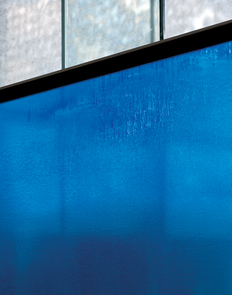 Kate Blee is best known for her vibrant textile designs. At Canary Wharf she has turned her hand to glass for the first time. Moving On explores the process of light and tone with almost painterly effect. This glass screen is made up of a series of six panels each painted with a different shade of strong blue enamel from swimming-pool to cerulean. Further examples of Blee's work can be found at the Crafts Council and the Victoria & Albert Museum and her commissions include work for Portcullis House.